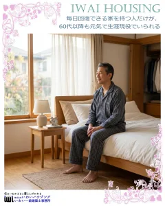 人生100年時代においては、自宅で過ごすことが多くなる60歳からの暮らしがとても重要になります。いわいハウジングは、この世代のための健康的な注文住宅を提供しています。WHOによると、健康は肉体的、精神的、社会的要素に生きがいが加わるものです。住まいはこれらの要素を向上させる重要な役割を果たします。理想の住まいは、快適でストレスが少なく、良質な睡眠を促進します。開放感のある大きな窓や効率的な間取り、自然の恵みを取り入れたデザインが暮らしを豊かにします。いわいハウジングと共に、生涯健康で家族が仲良く暮らせる理想の住まいづくりを始めませんか?