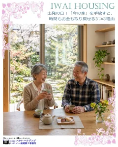 いわいハウジングは、人生100年時代にふさわしい健康的な住まいづくりをサポートします。快適な住環境は健康寿命を延ばし、家族との時間を楽しむために重要です。 住まいの改善ポイントは、高断熱性能による省エネと快適性の向上です。これにより、室内は常に快適な温度が保たれ、エネルギーの無駄が減ります。また、寒暖差や音、臭い、化学物質、電磁波といったストレス要因を軽減し、健康的な環境を提供します。耐震性の向上も図られ、地震時の安全性が強化されています。 住まいを改善することで暮らしが変わり、人生が豊かになります。ご家族の健康のために、住まいの創り変えをぜひご検討ください。