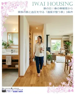 いわいハウジングは、人生100年時代にふさわしい健康的な住まいづくりをサポートします。快適な住環境は健康寿命を延ばし、家族との時間を楽しむために重要です。 住まいの改善ポイントは、高断熱性能による省エネと快適性の向上です。これにより、室内は常に快適な温度が保たれ、エネルギーの無駄が減ります。また、寒暖差や音、臭い、化学物質、電磁波といったストレス要因を軽減し、健康的な環境を提供します。耐震性の向上も図られ、地震時の安全性が強化されています。 住まいを改善することで暮らしが変わり、人生が豊かになります。ご家族の健康のために、住まいの創り変えをぜひご検討ください。