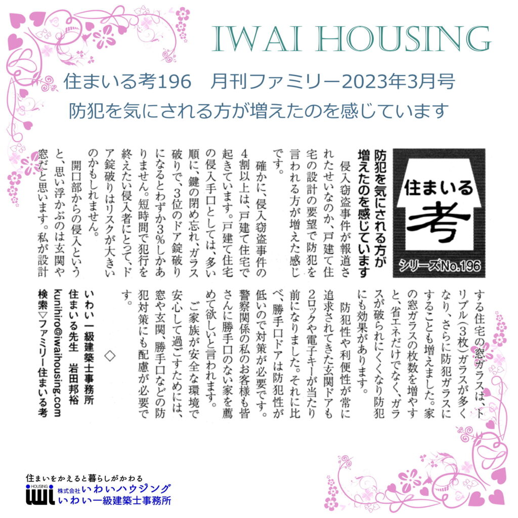 侵入窃盗事件が報道されたせいなのか、戸建て住宅の設計の要望で防犯を言われる方が増えた感じです。
