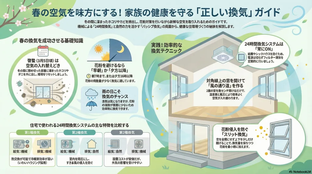 特に春は花粉も飛び始めるので、換気の仕方によっては逆効果になることも。
