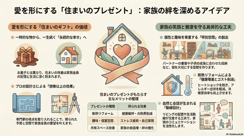 お菓子が数日で消えてしまう一方、住まいの改善は家族全員が毎日感じられる幸せを生み出します。