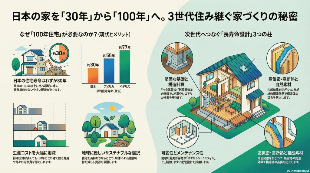 高気密・高断熱の木造住宅や無垢材の活用など、今日からできる「100年住宅」の秘訣をご紹介します 🔍