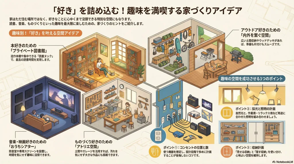 趣味を楽しむ家づくりのアイデアをご紹介しました。