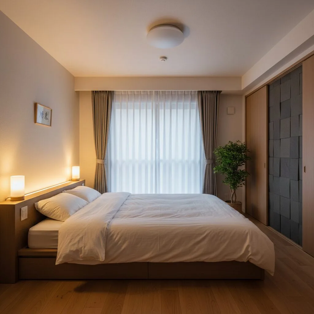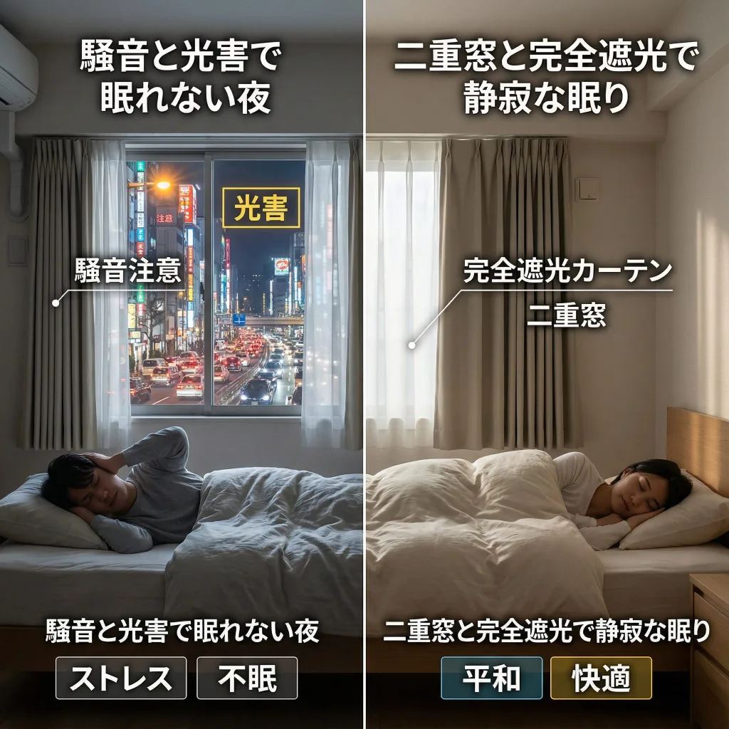 窓の配置をベッドに朝日が差し込まない位置にしたり、