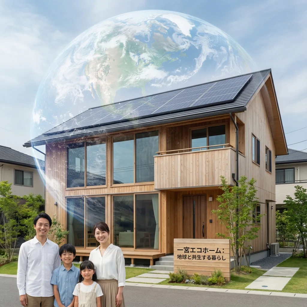 一宮市の住宅街をイメージした、緑豊かな環境の中に建つ現代的なエコ住宅を撮影したフォトリアルな広角ショット。屋根には太陽光パネル、大きな高性能窓、自然な木材の外壁が特徴です。前景には4人家族(両親と子ども2人)が笑顔で立っており、背景には地球全体とのつながりを象徴する宇宙から見た地球の半透明オーバーレイを配置。自然光、リアルな質感、プロの建築写真スタイルで8K品質。