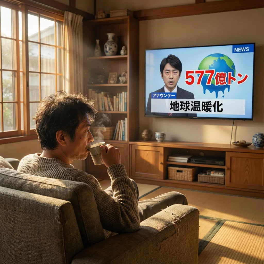 早朝の日本のリビングルームでのフォトリアルなシーン。中年の日本人がソファに座り、コーヒーカップを持ちながら壁掛けテレビを物思いにふけるように見ています。テレビ画面には「577億トン」「地球温暖化」という日本語テキストとグラフィックが表示されたニュース番組が映っています。窓から暖かい朝日が差し込み、空気中の塵が照らされている。リアルな質感、柔らかな照明、自然なライフスタイル写真スタイルで8K品質。