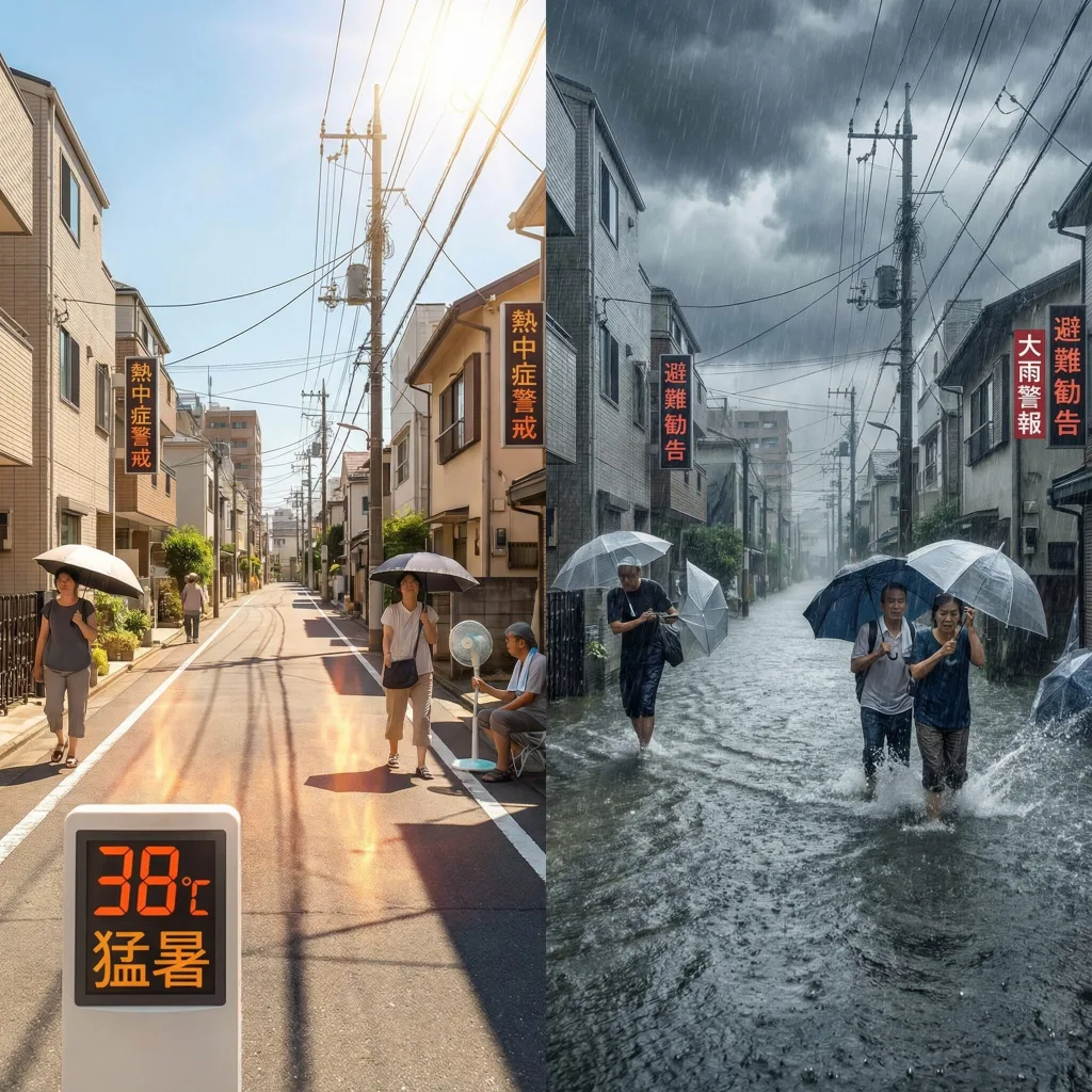 フォトリアルな分割画面構成。左側:猛暑の夏の日本の住宅街で、アスファルトから陽炎が立ち上り、38度を示す温度計、日傘や扇子を使う人々。右側:同じ通りが豪雨に見舞われ、浸水し、傘が裏返り、心配そうな住民たち。ドラマチックな自然光、リアルな天候効果、ドキュメンタリー写真スタイルで8K品質。