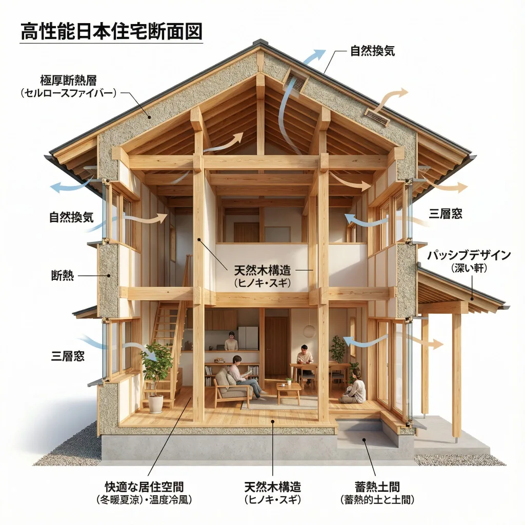 現代の日本のエコ住宅の内部構造を示すフォトリアルな断面図。壁と屋根の厚い断熱層、三層ガラス窓、屋根の太陽光パネル、熱交換換気システムが表示されています。内部では、暖かい照明の中で快適な生活空間を楽しむ日本人家族が描かれています。「UA値0.26」「C値0.20」を示す透明な技術的オーバーレイ付き。プロの建築図面とライフスタイル写真を融合したスタイル、超詳細、8K品質。