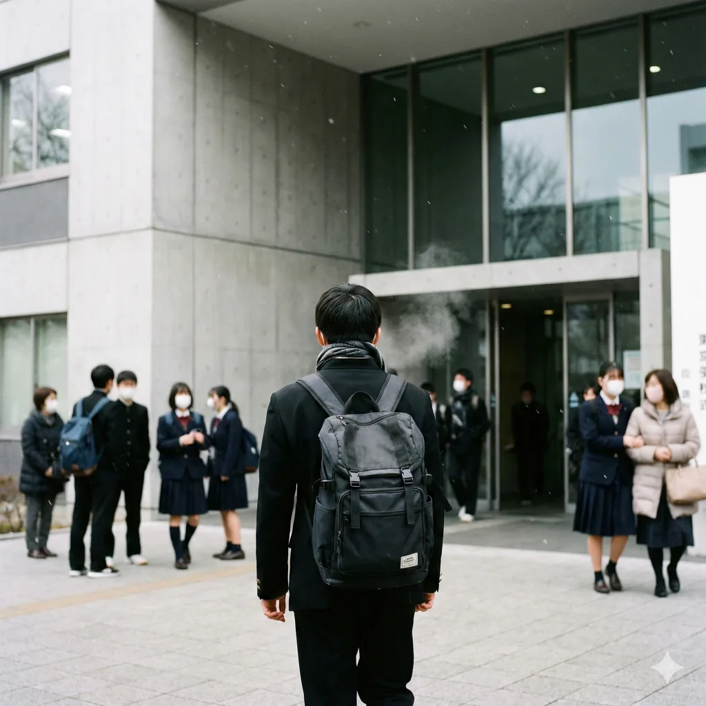 緊張した表情で試験会場に向かう
