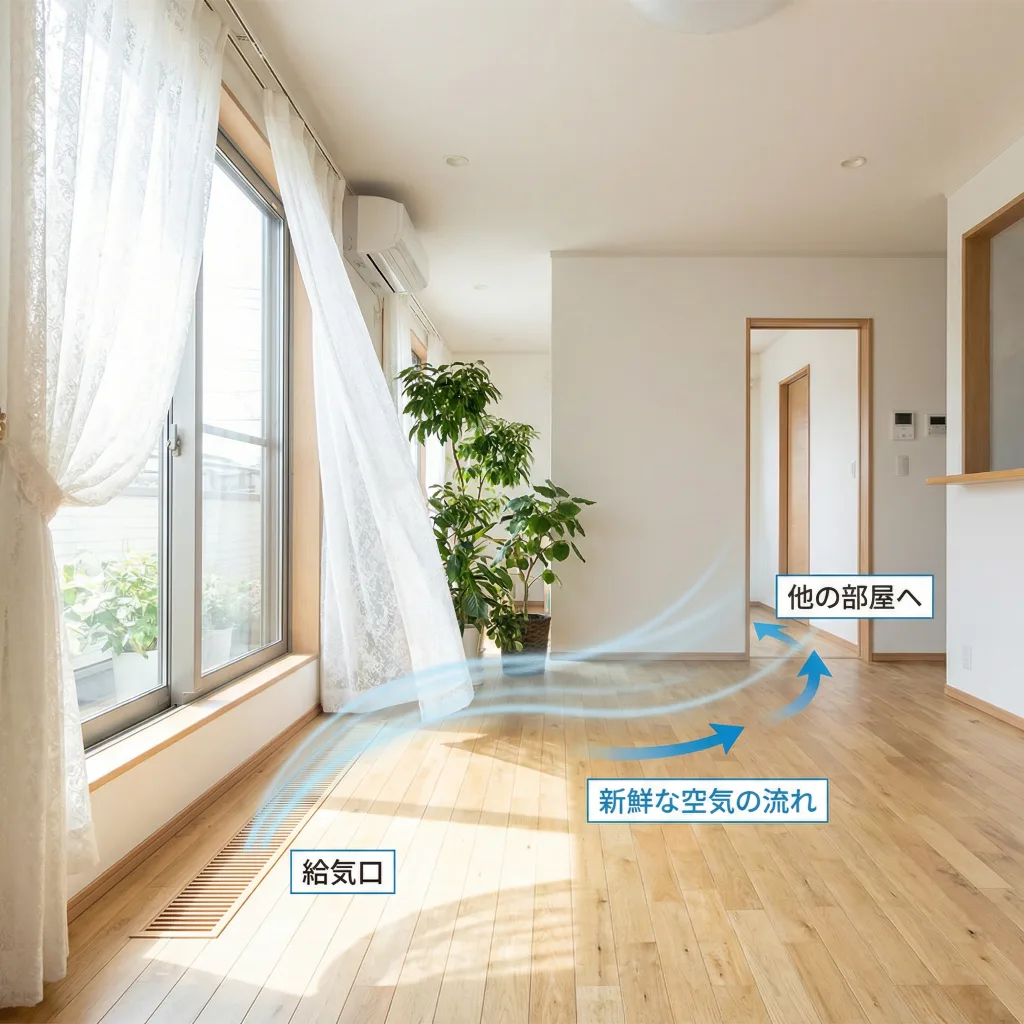たとえばリビングなら、窓側に給気、