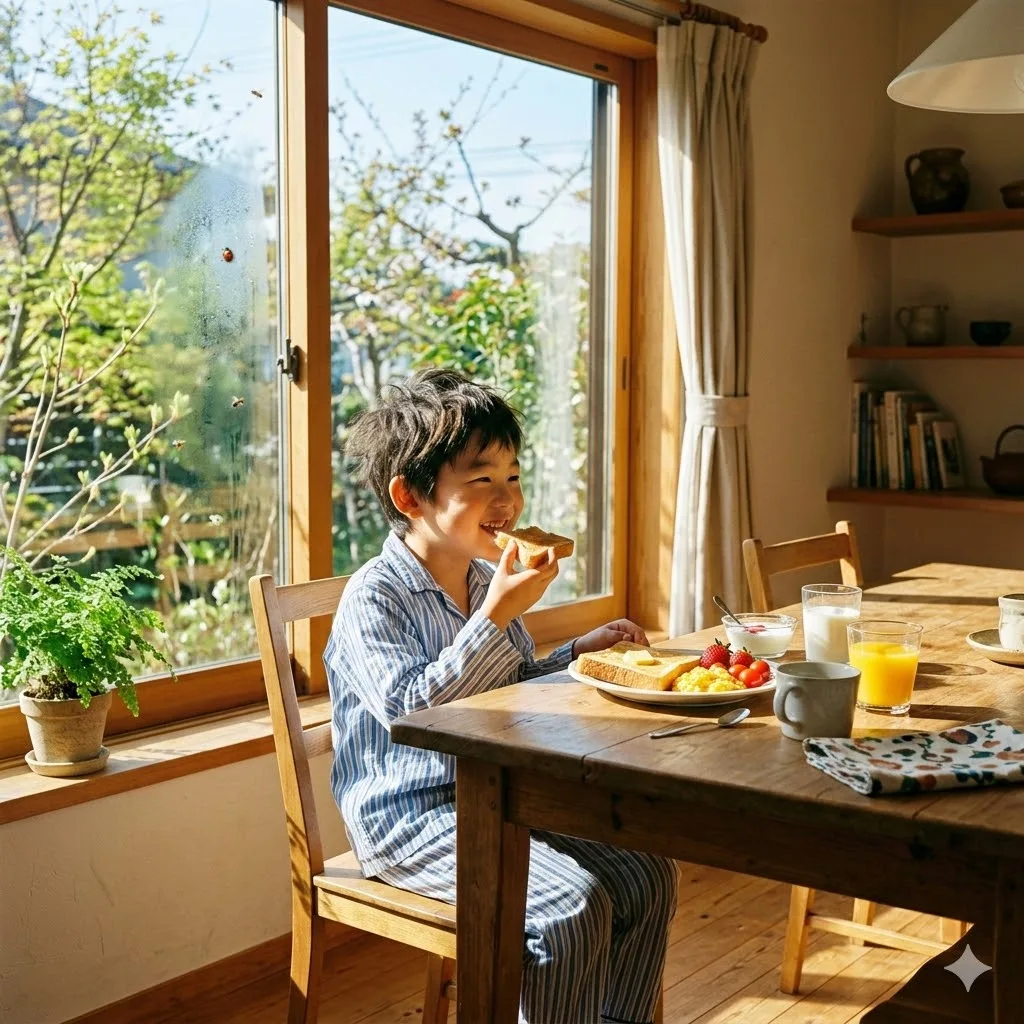 子供が朝食をとる場所に光が届けば、