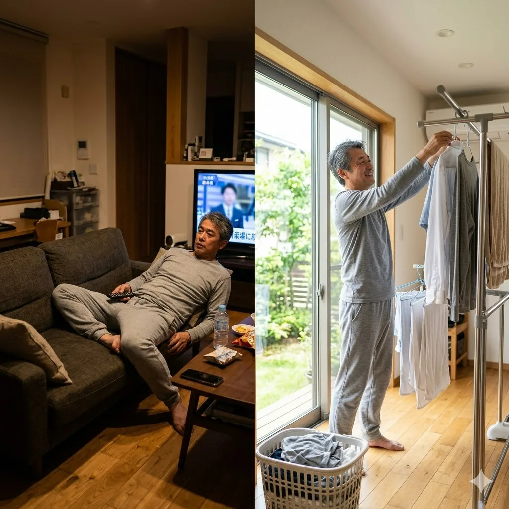 洗濯や片付けで体が動く動線、