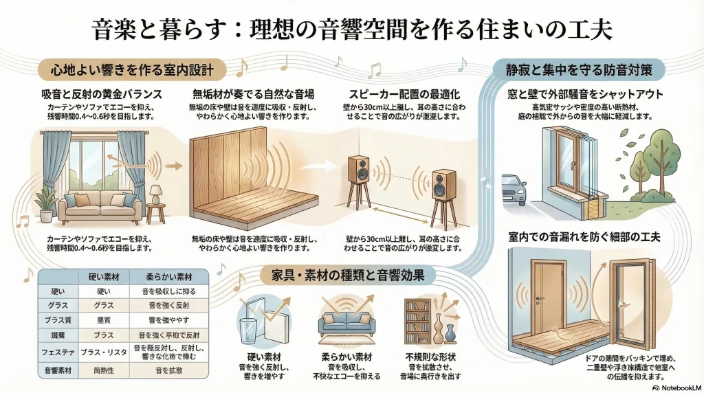 これらをバランスよく配置することで、エコーを抑えつつ、音楽の豊かさを損なわない空間を作ることができます 🏠