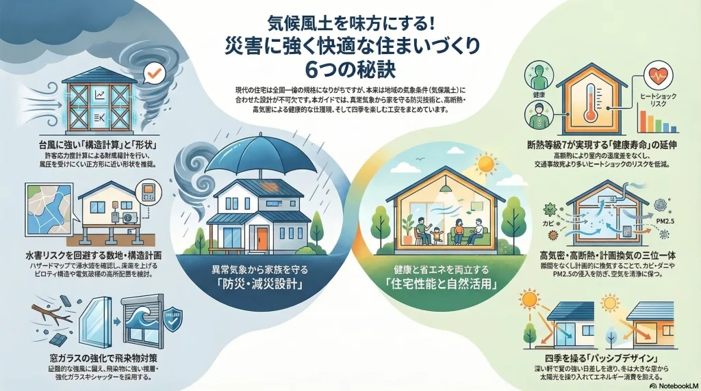 本記事でご紹介したように、地域の気候特性を理解し、それに対応した設計や工夫を取り入れることで、防災性能と快適性を兼ね備えた住まいを手に入れることができます。