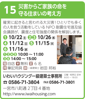 “一宮まちゼミで4講座(元気な暮らし・アレルギー・耐震・撮影)を好評のうちに終了!” に対して1件のコメントがあります。