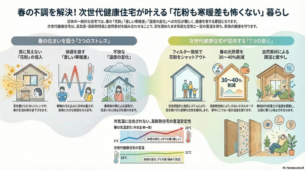 次世代健康住宅は単なる冬の暖かさだけでなく、春先の健康と快適さを守る盾になるのです。